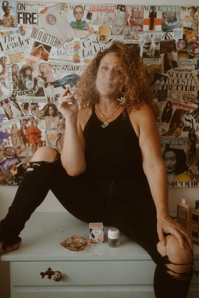 image of Canna Boss Babes founder Ishqa Hillman smoking a joint in front of a collage wall
